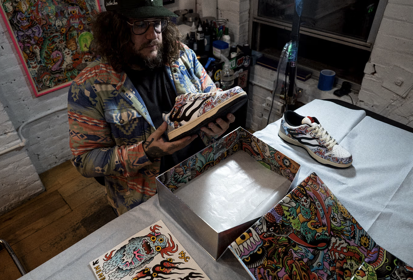 At roosi, I led the collaboration with tattoo artist Henbo Henning to bring his first-ever custom sneaker to life. Known for his style that blends American and Japanese traditional motifs, Henbo transformed the low-top silhouette into FLAME GHOST 1 — a moving canvas of folklore monsters, ghosts, and hauntingly playful creatures. My role was shaping how the artwork lived on the sneaker and positioning the release so it felt more like an art object than a product.
